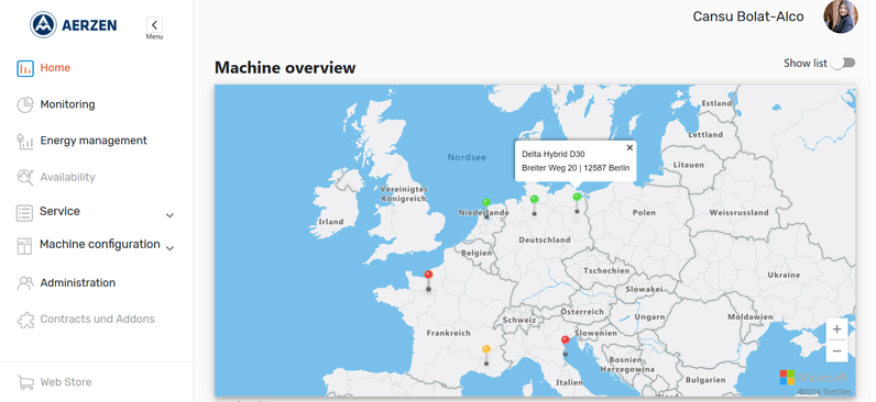 Como paquete básico, Aerzen ofrece la gestión de parques de máquinas fácil de usar. Los usuarios pueden ver todas las plantas activas en un mapa mundial interactivo y pueden seleccionarlas específicamente. Esto le permite ver de un vistazo qué máquinas están en funcionamiento, cuándo se debe realizar el mantenimiento o dónde puede estar presente una falla.