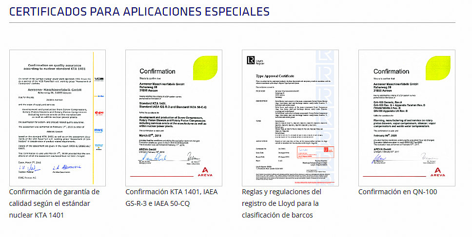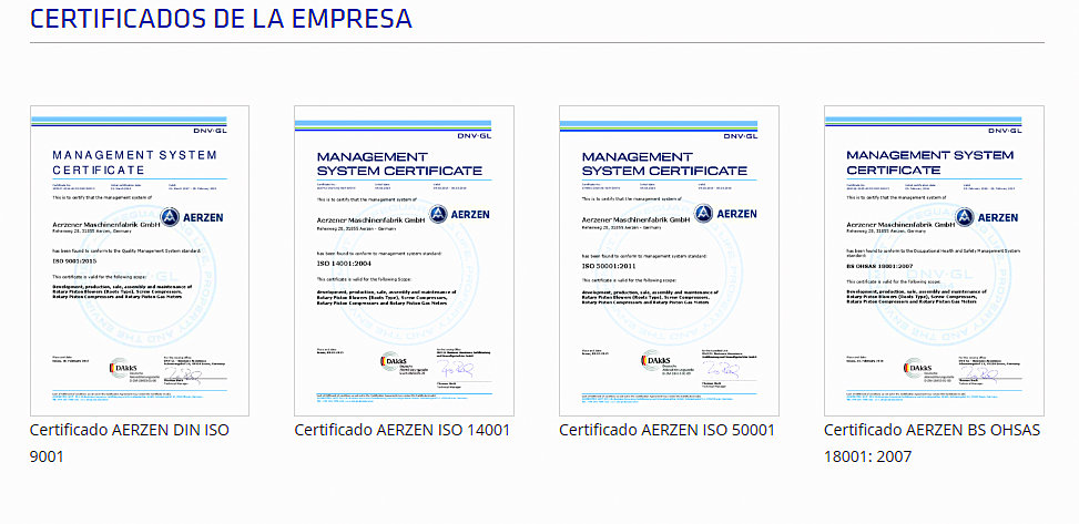 Numerosos certificados de calidad evidencian, que dentro de las compañías productoras del grupo Aerzen la calidad es nuestra prioridad. A principios de 2017, Aerzen Alemania implementó un sistema de gestión integrado auditado con los componentes DIN EN ISO 9001 (gestión de calidad), 14001 (gestión medioambiental) y 50001 (gestión de energía), así como OHSAS 18001 (gestión de protección laboral y de seguridad). Además, tienen la certificación ISO 9001 (aplicadas también en Aerzen Bélgica, Hungría, EE. UU., China, India y Corea). De hecho, Bélgica, China y EE. UU. tienen los certificados más recientes, según ISO 9001: 2015.