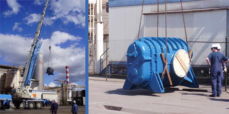 • Una de las soplantes funciona con presión a un caudal de 48.516m3 / h y 668 mbar (presión diferencial)  y la otra de bajo vacío a una velocidad de flujo de 66.984 m3/he (vacío de -668 mbar), con agua de sellado, accionado por un motor Siemens 2250 kW, utilizando una caja de transmisión.
