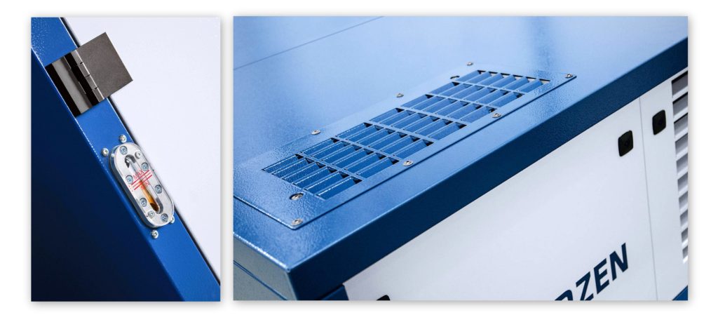 - Enrutamiento del aire de escape caliente sobre el techo de la campana acústica, con la opción de recuperación de calor (conexión de conducto separada).