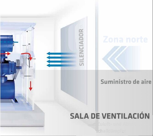 El término habitual de la ‘ventilación de aire comprimido’ en realidad no es correcto, ya que no se trata de aire comprimido sino de entrada de oxígeno en la sala de instalación y también de la orientación del edificio en la dirección de la brújula. Una aspiración alternativa de las máquinas a través de una tubería, directamente desde el exterior, también puede tener inconvenientes, ya que el ruido de aspiración se desplaza casi directamente hacia el exterior.